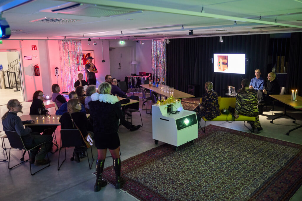 Itsenäisyyspäivän aaton Ovi Kummaan on edennyt vaiheeseen, jossa taustalla soi DJ:n valitsema musiikki, ja osallistujat voivat omien kuviensa pohjalta alkaa luoda teoksia omista puhelimista löytyvistä valokuvista ja sivupöydän materiaaleista.